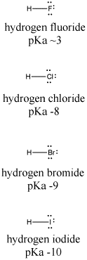 Let's look at another example, comparing the pKa's of hydrogen halides. These compounds are all much stronger acids than water. Hydrogen fluoride, HF, has a pKa of 4. Hydrogen chloride, HCl, has a pKa of -1. Hydrogen bromide, HBr, has a pKa of -5, and hydrogen iodide, HI, has a pKa of -7.