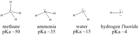We can compare the pKa's of methane (CH4), ammonia (NH3), water (H2O) and hydrogen fluoride (HF) to examine these ideas. Carbon, nitrogen, oxygen and fluorine are all in a row in the periodic table. Fluorine, to the right, has the highest core charge and highest electronegativity. Carbon, to the left, has the lowest. Water should be a stronger acid than ammonia, which should be more acidic than methane.