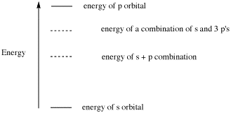 The energy of the electrons in this bonding situation will be an average of the energy of an s electron and three p electrons. In terms of carbon's energetic contribution, the energy of the electrons in the C-H bond will be three-quarters of the way between what would be expected if the bond formed between an H atom and a carbon 2s electron and if the bond formed between an H atom and a carbon p orbital. That is because the energy should be an average of the energies of all four orbitals that could contribute to that bond.
