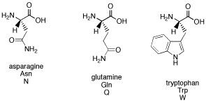 In contrast to the basic amino acids shown above, other amino acids with nitrogen in their side chains are not considered basic. These compounds are not protonated easily on their side chains.
