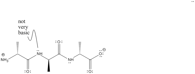 Amino acids are joined together via "amide linkages" to form peptides and proteins. In these structures, the individual amino acids no longer have the same acidic carboxylic acid group; the carbonyl (or C=O) no longer has a hydroxyl group attached. The amino acids no longer contain amines, either; a nitrogen attached to a C=O has very different properties than a regular nitrogen attached to carbon. Only the "N-terminus" and "C-terminus" are ionic. The nitrogens along the chain are not very basic and are not protonated.