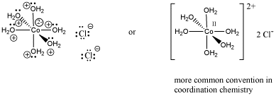 Notice that the usual Lewis conventions are usually abandoned in drawing coordination complexes of transition metals. With so many different nucleophiles sticking to the Lewis acid, the number of formal charges that must be drawn becomes very cumbersome. Usually the oxidation state of the metal cation is denoted. The oxidation state essentially means the charge on the metal cation and it is written in Roman numerals beside the metal atom. In addition, the overall charge on the Lewis acid-base complex is given, with square brackets indicating that the charge belongs to the entire complex within the brackets. Exactly where that charge resides is up to the reader to consider.