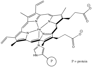 Figure AB6.4. Hemoglobin. Most of the molecule is not shown. The iron-containing heme subunit is attached to a large protein via an imidazole ring in a histidine amino acid residue.