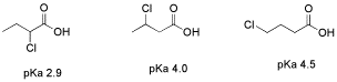 An important limitation on inductive effects is seen in comparing a series of chlorobutanoic acid derivatives. In 2-chlorobutanoic acid, the presence of a chlorine next to the carbonyl, four bonds from the acidic proton, renders this compound much more acidic than butanoic acid; the pKa's are about 2.9 and 4.8, respectively.