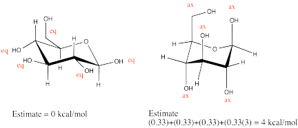 With a CH3, every such conformer would show a 1,3-diaxial interaction. With an OH, only 1/3 of them would. The steric strain for an axial OH is thus 1/3 (1 kcal/mol) = 0.33 kcal/mol.