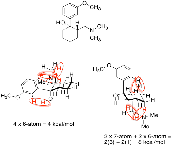 e) If the one on the left is active, a lower dose can be used because it will spend more time in the active form and be able to bond more receptors. If the less stable one, on the right, is the active form, a higher dose will be needed because only a small fraction of the molecules will be ready to bind the receptor at any given time.