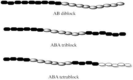 There are different kinds of block copolymers, depending on how the blocks of each monomer are arranged in the chain. The simplest kind of chain would contain one long block of the first monomer followed by one long block of the other. That's called a diblock (or AB diblock) copolymer . If two blocks of the same polymer are found on the ends, with a different one in the middle, that would be called an ABA triblock copolymer. If there were three different blocks from three different monomers, we would have an ABC triblock copolymer instead. There are lots of possible variations.