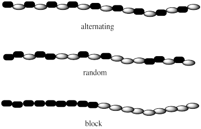 If there are two different monomers, they may be arranged in different ways along the chain. Maybe the two monomers simply alternate, one after the other: that's called an alternating copolymer. Maybe they are distributed at random: that's a random or statistical copolymer. Maybe they are clustered in two separate groups: that's called a block copolymer.