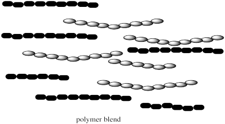 These copolymers are different from polymer blends. Polymer blends are just mixtures of two different kinds of polymers. Both polymer blends and copolymers are important. Either one might allow different properties of each polymer, such as strength and flexibility, to be brought together in one material.