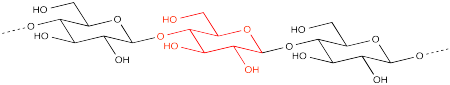 Cellulose is made of a long chain of sugar units strung together in a chain. In the picture, the dashed lines indicate that the chain is continuing on. The individual sugar units are all D-glucose. These polyhydroxylated rings are all enchained in exactly the same way, forming a repeating pattern from one end of the molecule to the other.