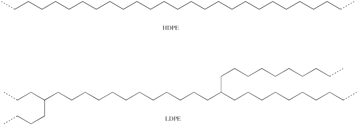 b) LDPE has a slightly lower density than HDPE. Explain why.