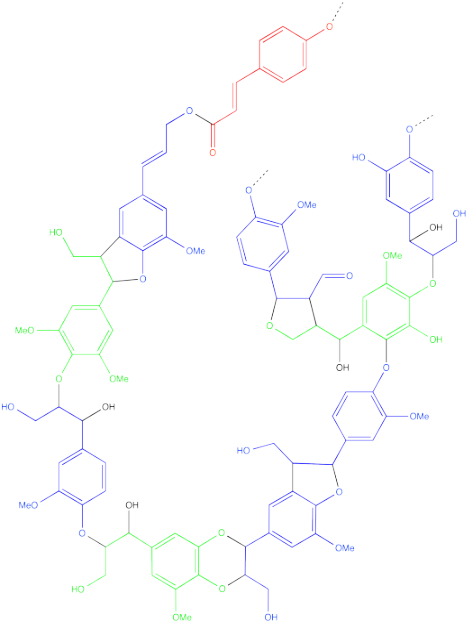 Lignin has a more complicated structure than cellulose. It is also formed from monomers, but the structures of those monomers are less regular than in cellulose. Furthermore, they are put together in more complicated ways, rather than all being joined together in an identical fashion.