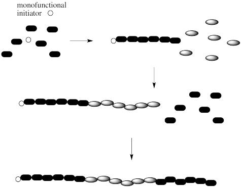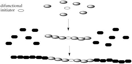 Note that there are a couple of different ways of making block copolymers. We can simply start growing the chain from one end, as shown above. Alternatively, we might start with a difunctional initiator. That's an initiator that starts gorwing the chain in two directions at once. The result is called a "telechelic polymer". This method of growth can be more efficient in some cases.