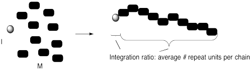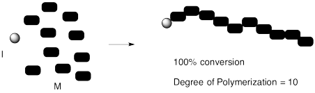 We can confirm that outcome experimentally by measuring the ratio of monomer to initiator in the polymer that is produced. That evidence is sometimes obtained by integration of a 1H NMR spectrum. The "degree of polymerization" is the measured number of repeating units in the chain. In the case below, we started with 10 monomers per initiator and ended up with DP = 10.