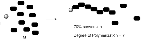 For now, we are going to focus on chain growth because there are some specific features of this process that are useful to know about, and they might be a little less intuitive than what happens with step growth. In chain growth, if each initiator in the process starts its own chain growing, then the ratio of monomers to intiators that we start with may tell us the chain length we will end up with. We refer to that ratio as the feed ratio. If we start with ten moles of monomer and one mole of initiator, the feed ratio is 10. Once that initiator starts a chain growing, there should be nine monomers left, and we would predict the chain would be ten units long. But if we start with a hundred moles of monomer and one mole of initiator, then as soon as it starts growing the growing chain would have ninety nine more monomers it could enchain, and we would predict it could make a polymer one hundred units long.