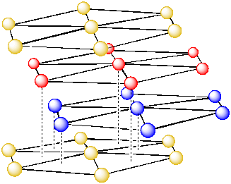 Because the atoms in the top layer are directly over the atoms in the bottoms layer, we can think of these two layers as being identical. We can show that by drawing them in the same colour.