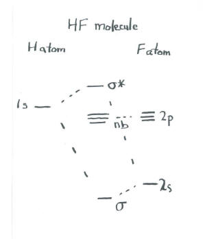 A molecular orbital picture of HF could involve an s orbital on hydrogen interacting with an s orbital on fluorine. It may be that the three p orbitals on fluorine stay out of the way, do not interact with the hydrogen, and remain unchanged in the molecule. In that case, we are dealing with a picture of two s orbitals combining, as in dihydrogen.