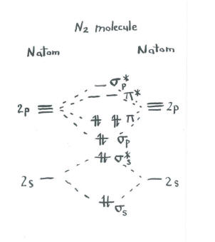 The six electrons in the s p bonding and the p bonding levels, however, represent a decrease in energy from the energy levels in the free nitrogen atoms. These three, low-energy pairs of electrons indicate three bonds between the nitrogen atoms.