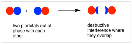 The out-of-phase combination (meaning in this case that the overlapping lobes are out of phase) results in destructive interference. This combination is at shorter wavelength than the original orbital. It is a higher energy combination.