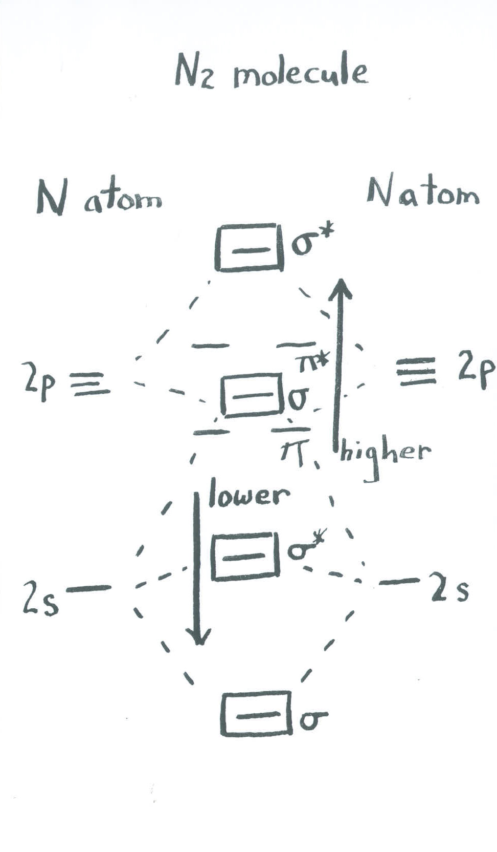Another way of thinking about this mixing effect is to take the molecular orbital picture we already made for dinitrogen and then say that the sigma bonding orbitals can interact with each other. That means they can push each other up or down in energy, mixing together to create new combinations with new energies. The extent of this mixing varies across the periodic table.