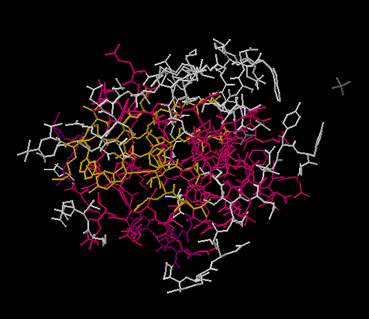 The other problem is that a ball-and-stick model of a protein contains an awful lot of atoms. The structure gets pretty complicated. The example here is a pretty small protein; its molecular weight is only about 35,000 D (D stands for Daltons; a Dalton is just another term for atomic mass unit or amu, but it is used more commonly in biochemistry and macromolecular chemistry). In larger proteins, its difficult to make sense of the pile of atoms we see in a ball-and-stick structure.
