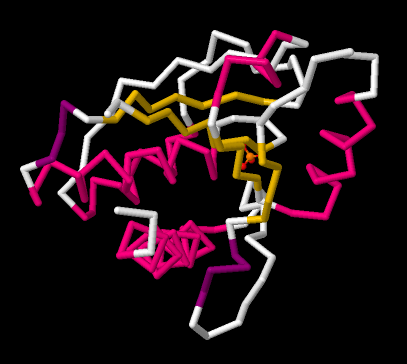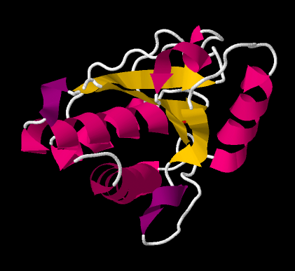 In the backbone drawing of bovine low molecular weight tyrosyl phosphatase, you can see where parts of the backbone are coiled up into alpha-helices. These parts are coded in pink in the picture. You can also see some sections that form pleated beta-sheets. Those are the yellow, zig-zag sections next to each other.