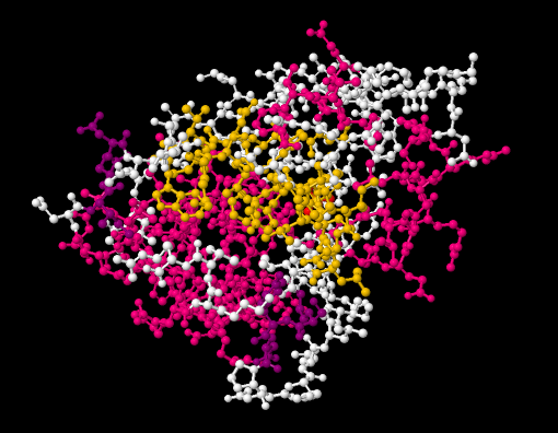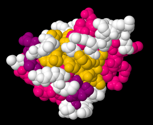 Similarly, we could view the protein in a space-filling model. The space-filling model probably gives a better picture of what the molecule would look like in terms of how much room it would take up, or what its overall shape would be. The advantage of this view is that it allows a biochemist to see how other molecules might interact with the protein.