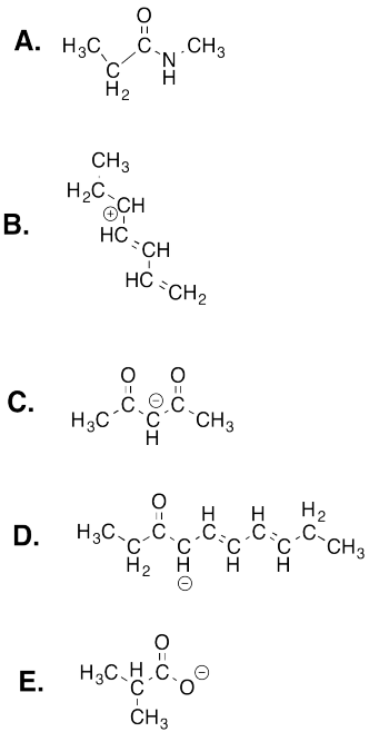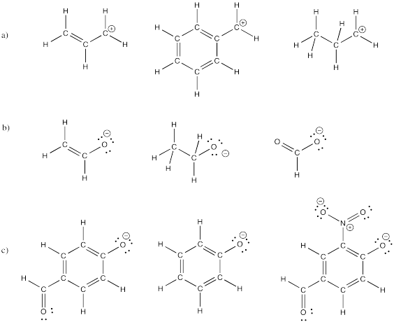 Ions can be greatly stabilized by delocalization. That is, if a charge can be spread out over several atoms by resonance, the charge is more stable. Use this idea to predict the relative stabilities of the following ions (rank them from most stable to least stable).