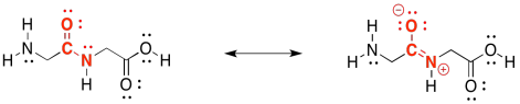 In fact, peptide bonds are a little stronger and harder to break than either ester linkages or acetal (glycosidic) linkages. That's because of a resonance contributor to the structure. Notice that oxygen is more electronegative than nitrogen. That oxygen is able to pull the lone pair on the nearby nitrogen closer, forming an N=C π bond that makes the amide stronger and more stable. We still have special enzymes that can break down proteins in our food, but it's not easy.