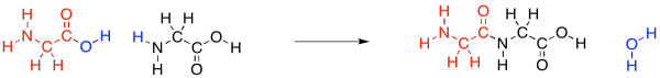 As in lipids, exactly how these two molecules eventually come together is slightly more complicated than that, but this picture is good enough for now. Two amino acids (two monomers) connect together to make one bigger molecule (a dimer) and a water molecule. That dimer is often called a "dipeptide". The bond that has formed between the nitrogen and the carbonyl is called an "amide" bond in organic chemistry, becasue the funtional group formed is called an amide. In biochemistry, this bond is often called a "peptide linkage". It's what holds the two pieces together in a dipeptide.