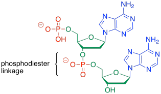 To form a co-polymer, another phosphate ester bond forms with the sugar of another nucleotide. The phosphate between the two sugars is sometimes called a phosphodiester linkage, meaning that the phosphate is forming two esters at once to bridge the two sugars.
