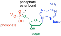 The third type of molecule that comes together to form the nucleic acid co-polymer is a phosphate. It becomes covalently bonded to the primary alcohol group at the other end of the ring from the base. The bond between the phosphate and the sugar is called a phosphate ester bond. The new compound is called a nucleotide.