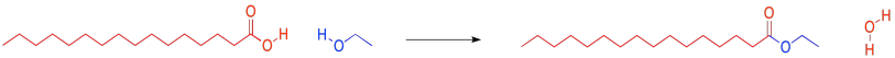 One common group of biomolecules is called "lipids". Lipids can really have lots of different structures. However, the most common type of lipid is an ester. An ester contains an O-C=O unit. Sometimes that group is termed an "ester linkage". We can think of that link as being formed when a carboxylic acid comes together with an alcohol. The carboxylic acid is shown below, in red; the alcohol is in blue. This reaction is often referred to as a condensation reaction because it produces water as a side product. If this reaction were carried out in a glass vessel, you might be able to see moisture condensing on the glass as the reaction proceeds.