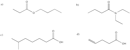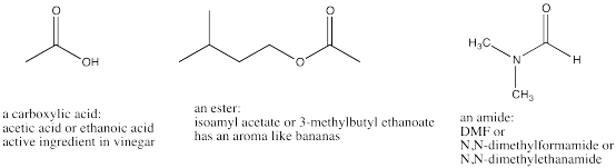 Naming simple examples of these compounds, as before, involves a change in the suffix of the name.  The suffix for a carboxylic acid is "-oic acid".  Esters really have a two-part name.  The first part describes the group attached to the enchained oxygen atom of the ester, with the suffix "-yl".  The second part describes the portion that contains the carbonyl, with the suffix "-oate".  For an amide, the suffix is "amide".  However, other groups attached to the nitrogen are usually prefixed with "N-"; this is a little like numbering the position of a group in previous examples, but this time it underscores that the group is attached to a nitrogen.