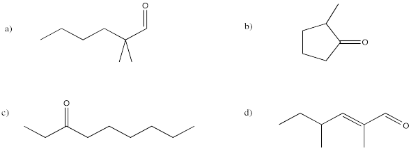 Aldehydes and ketones have specific naming conventions.  The suffix for the name of an aldehyde is "-al"; whereas the suffix for the name of a ketone is "-one".  In the case of a ketone, the location of the carbonyl along the chain can be described with a number.  Otherwise, the names of aldehydes and ketones follow the rules we have seen for other organic compounds.
