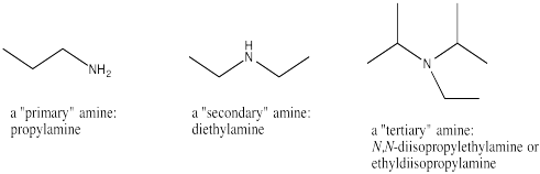 Amines contain nitrogen atoms connected to three different atoms, but not connected to a carbonyl. If the nitrogen is attached only to one carbon, the functional group is a primary amine. If it is attached to two carbons, it is a secondary amine. If it is attached to three carbons, it is a tertiary amine.  This classification system is a little bit different from the one used with alcohols, in that it refers to the number of things attached to the nitrogen itself.  In oxygen compounds, the number of things attached to the oxygen determined whether we called it an alcohol or an ether.