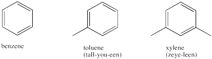 Aromatic compounds, or arenes, appear to contain C-C double bonds but they are very different from alkenes. The most common arene is benzene, so sometimes arenes are also called benzenes. Because benzene is a very common structural piece, you should be familiar with some of the language associated with it.