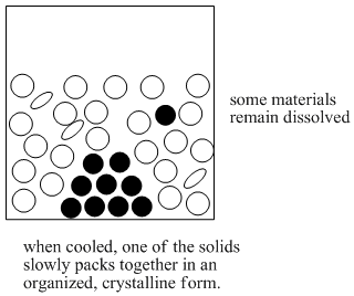 There is one more part of this process that would make it a complete recrystallization. If the sodium oleate forms an amorphous solid when it comes back out of solution, we have precipitation. If the sodium oleate forms a crystalline solid when it comes back out of solution, we have recrystallization. An amorphous solid contains molecules that are packed together in random ways. A crystalline solid contains molecules that are ordered in a specific way.