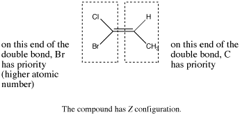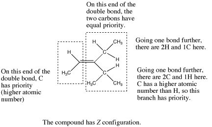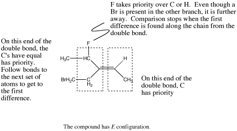 If the first atoms attached to one end of the double bond are the same, go one bond further on each chain and compare all the atoms that come next. If one of the chains at this point contains an atom with a higher atomic number than any of the atoms on the other chain, it is given higher priority.