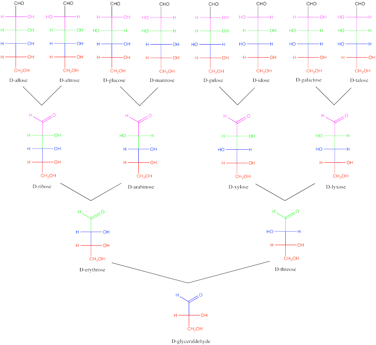 Carbohydrates can be classified according to their stereochemistry, forming a sort of carbohydrate family tree. They are considered to originate from the simplest carbohydrate, glyceraldehyde. Addition of a new carbon to the C=O unit of glyceraldehyde produces two possible isomers, because a new steresocentre is formed. From there, additional carbohydrates can be built up, one carbon at a time. In the carbohydrate family tree, glyceraldehyde is great-grandmother.