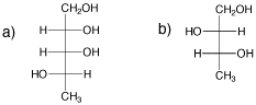 b) If you turn it so that the carbonyl is at the top and the OH and H of the second chiral carbon are coming towards you, is the first OH on the right or on the left?
