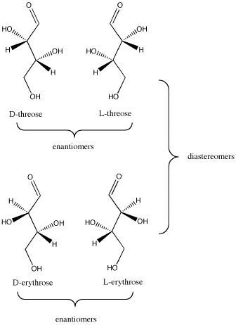 However, D-threose also has other stereoisomers that are NOT its mirror image. These isomers are called diastereomers. These compounds have different physical properties from threose, so they have a completely different common name. That's because common names for compounds were often coined before anyone knew about the structure of the compound.