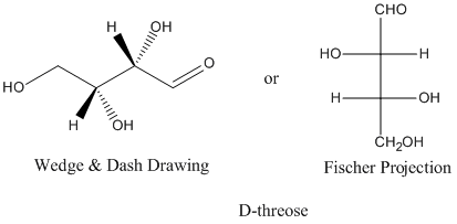 The relationships between D-threose and its stereoisomers can be seen in wedge-dash projections. The family of aldobutanoses -- that is, four-carbon dugars containing an aldehyde group -- is presented together below.