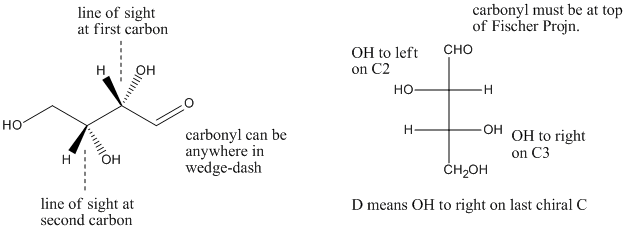 a) If you turn it so that the carbonyl is at the top and the OH and H of the first chiral carbon are coming towards you, is the first OH on the right or on the left?