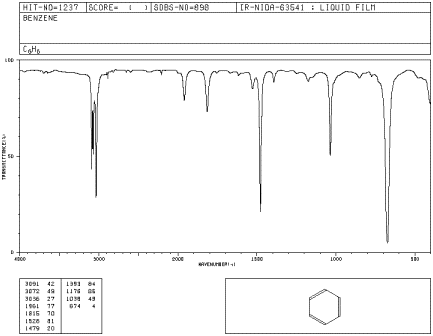 Figure IR1.1. IR spectrum of benzene.1 The x-axis labels are, from left to right, 4000, 3000, 2000, 1500, 1000 and 500 cm-1.