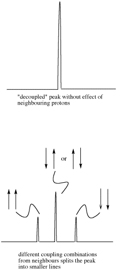 Figure NMR11.5 Effects of neighbouring protons on an observed peak. This case assumes all the neighbouring protons have an equivalent effect (they have the same coupling constant with the observed proton).