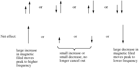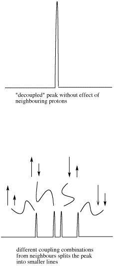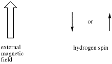 Sometimes coupling information is depicted as an arrow. This arrow stands for the coupling constant between two protons. The coupling constant is related to the spin of a hydrogen atom. The spin (related to magnetic moment) can be aligned with the external magnetic field (we will show it pointing up) or else against it; no other possibilities are allowed.