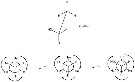 Figure NMR11.2. A sawhorse projection (top) and Newman projection of ethanol (bottom), showing the angular relationship between hydrogens on neighbouring carbons. The angle between two groups on neighbouring carbons is called the dihedral angle. Because of free rotation about the C-C bond, all three hydrogens on the methyl have an equivalent spatial relationship to the hydrogens on the CH2 group.
