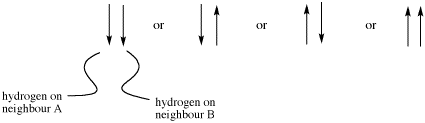 As a result, the two coupling constants are different. We can depict that situation using arrows of different lengths for the two neighbouring proton spins. Each spin can be either up or down, but now two opposing spins do not cancel out. The result is four spin combinations of equal probability, not just three.