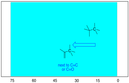 There are some more subtle factors that influence the shift of a carbon atom in the spectrum, having to do with what the neighbouring groups are in the compound. For example, a tetrahedral carbon shifts a little bit downfield if it is next to a trigonal planar carbon. The reason has to do with the way the magnetic field that is used in this experiment recruits the electrons of double bonds, essentially magnetizing them, as well.